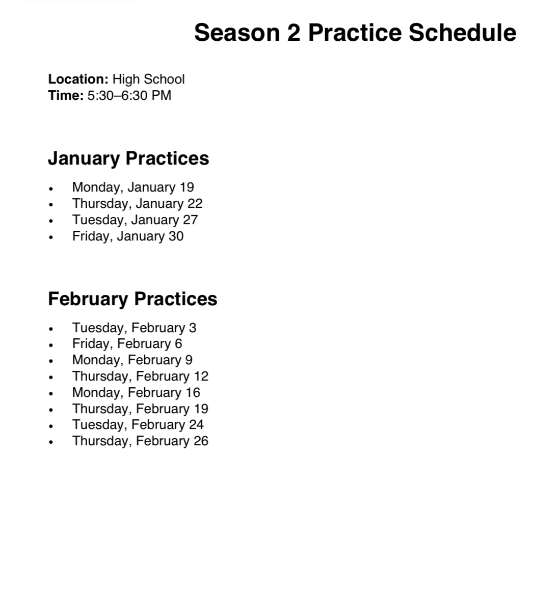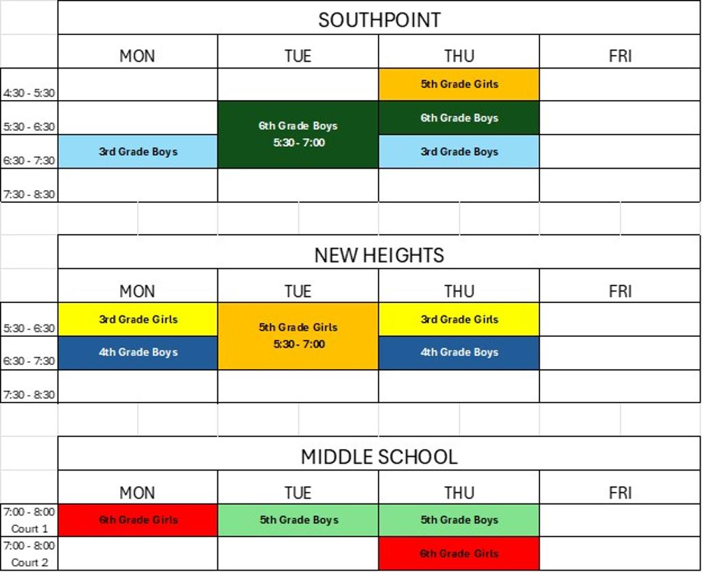 Below is the weekly practice schedule for grades 3-6 during Season 2. This schedule will go through the end of Season 2 which concludes after the last tournament played by each team.